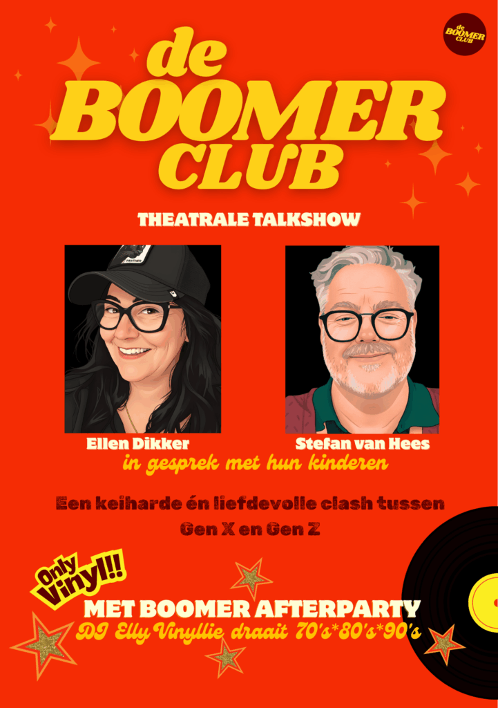 De Boomerclub is een maandelijkse theatrale talkshow, een spetterende podcastopname én een dansfeest ineen. Met Gen X-hosts Ellen Dikker en Stefan van Hees, Gen Z-kinderen én een Boomer Afterparty weet je meteen: dit wordt een geweldige zondagmiddag!
